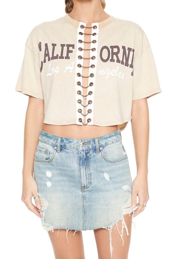 A jersey knit crop top featuring a round neckline. front ‘California’ and ‘Los Angeles’ text. front cutout with chain detailing. and short sleeves.
