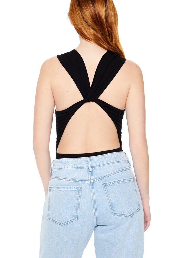 A jersey knit tank bodysuit featuring a round neckline. back cutout with twist design. and snap-button closures.
