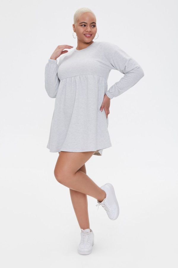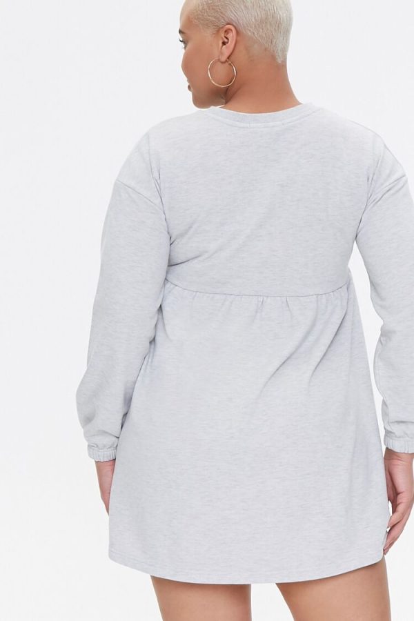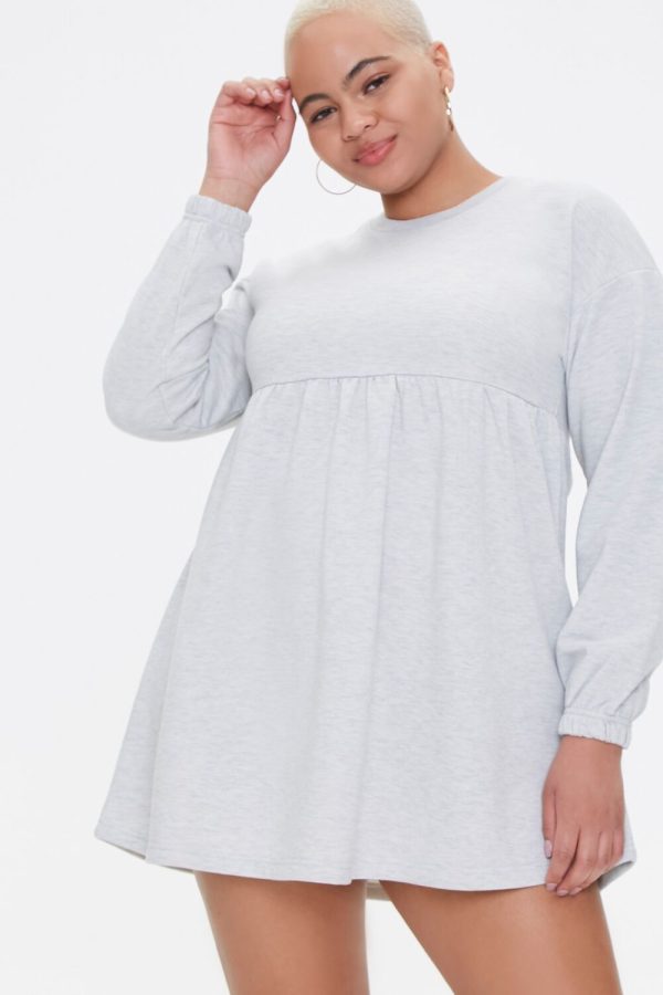 A fleece mini dress featuring dropped long sleeves. elasticized trim. and a crew neck.