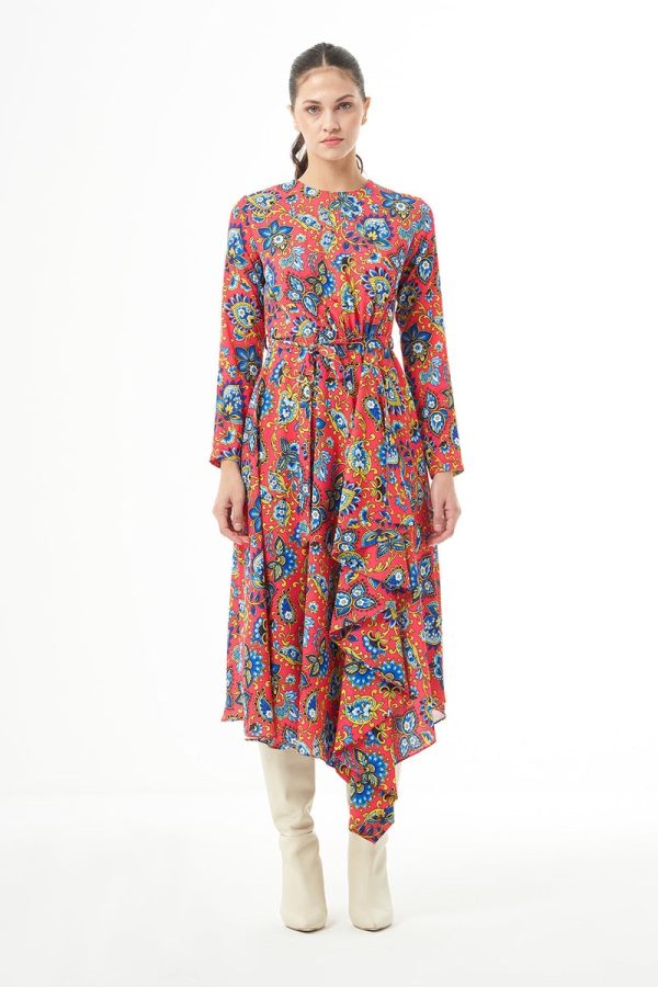 Patterned Buckled MIDI LENGTH Mzl Dress. 100% Polyester.Height: 125 cm. Chest: 52 cm. Sleeve length: 61 cm