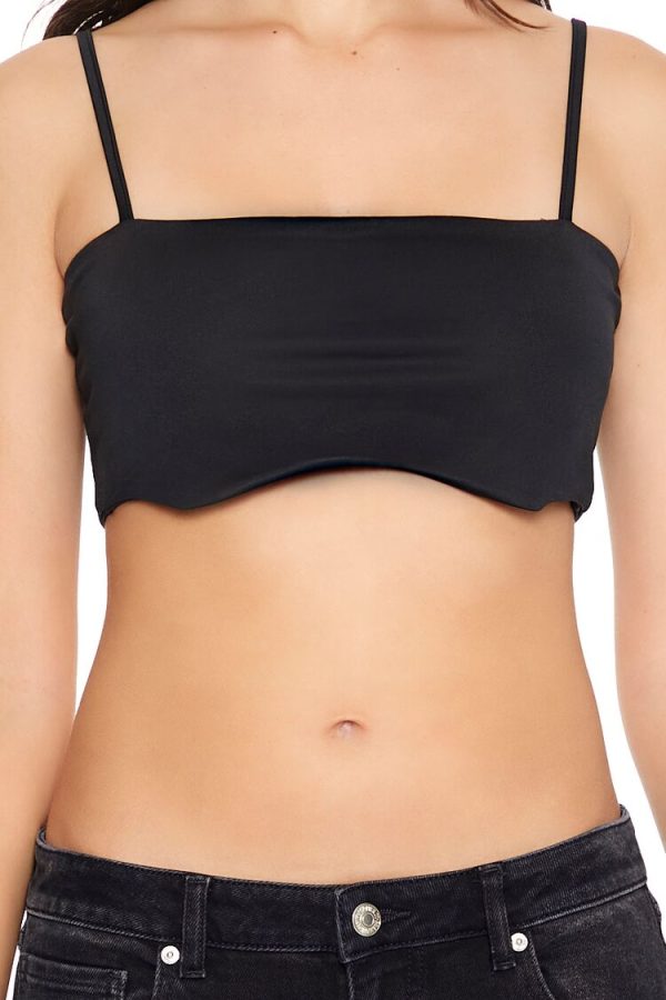 A knit cropped cami featuring a straight-cut neckline and back. notched hem. and adjustable straps.