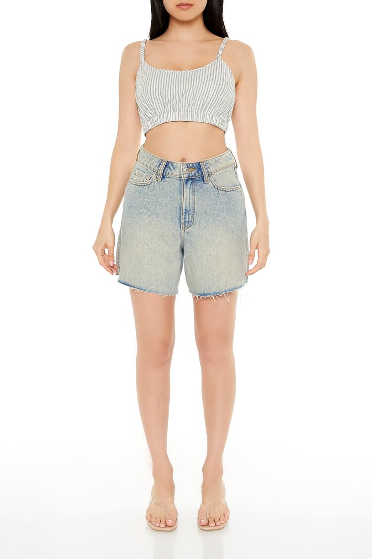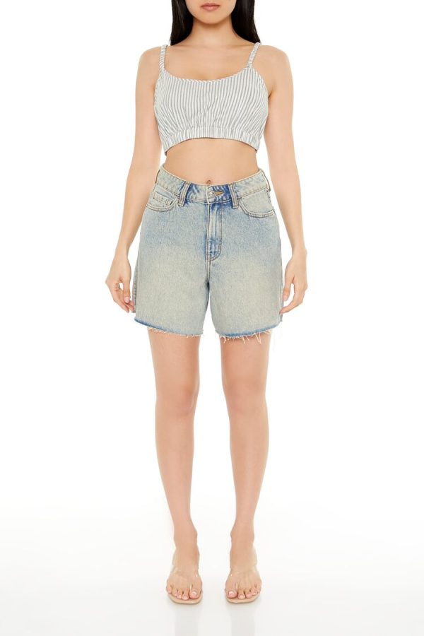A woven cami featuring an allover pinstriped pattern. straight-cut neckline and back. fixed straps. and a cropped hem.