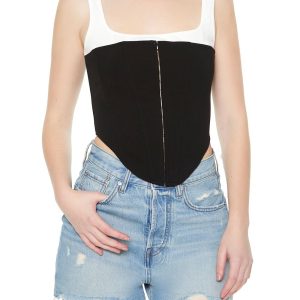 A knit cami featuring partial sheer mesh construction. sweetheart neckline. chest bow embellishment. lettuce-edge hem. seamed construction. and a straight-cut back.