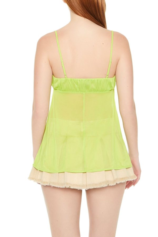 A sheer mesh cami featuring a straight-cut neckline and back. self-tie chest closure. adjustable straps. and a split hem.