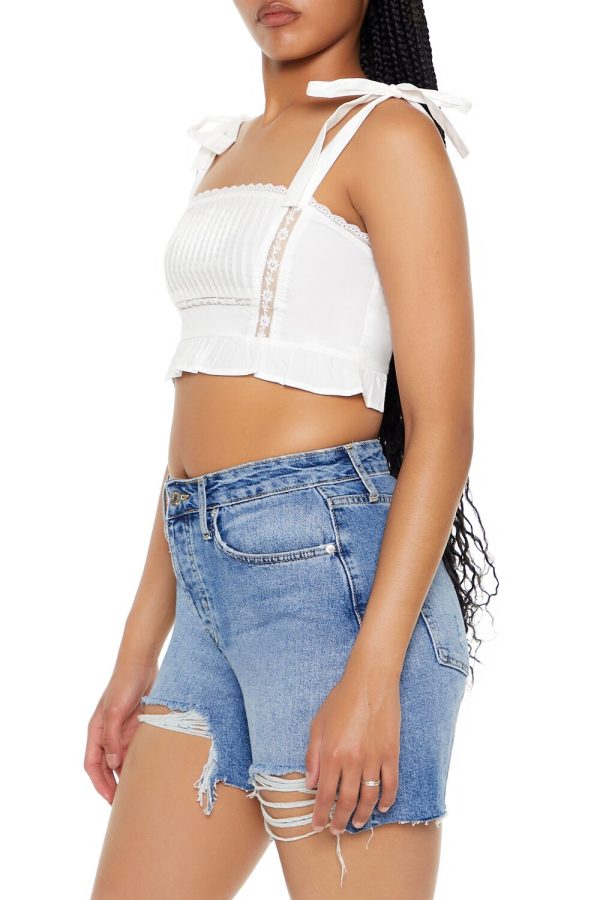 A woven crop top featuring self-tie shoulder straps. a square-cut neckline and back. lace trim. flounce hem. and a concealed back zipper.